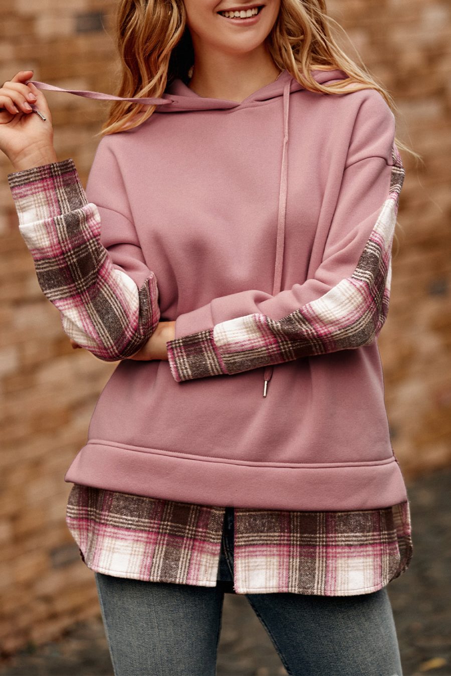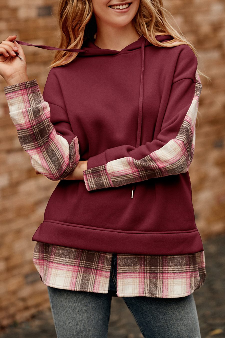Color Block Plaid Patchwork Hooded Sweatshirt quantity