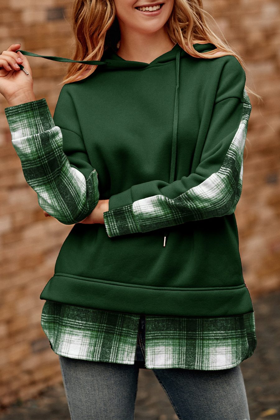Color Block Plaid Patchwork Hooded Sweatshirt